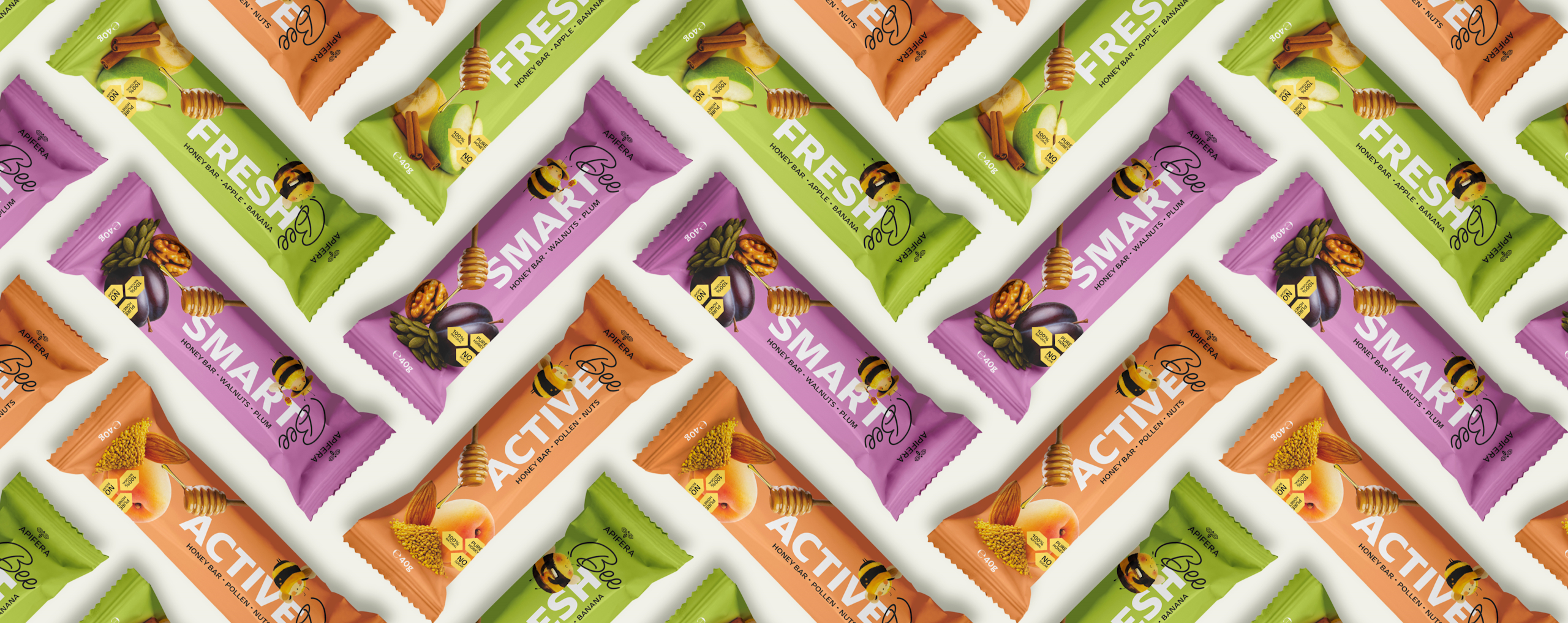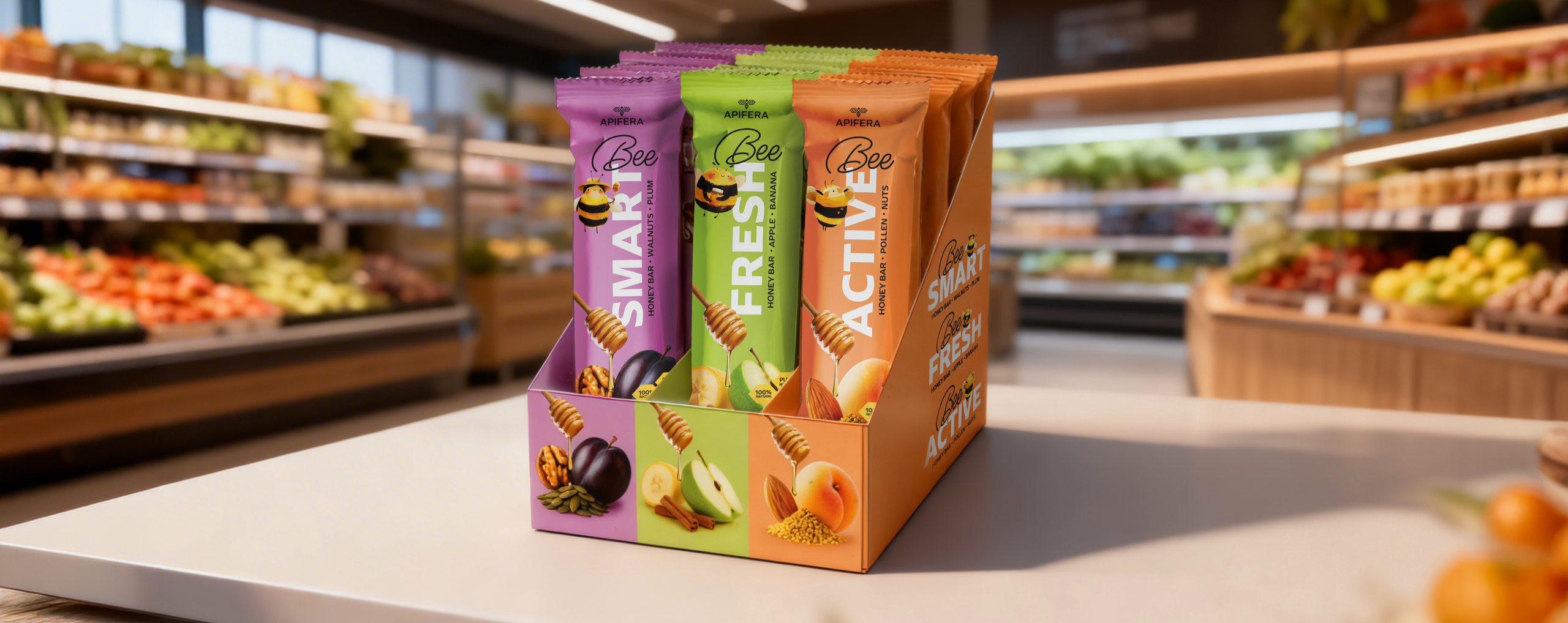 Pentru gama Honey Bars a APIFERA, LE BURO a dezvoltat un sistem de cutii care organizează vizual întreaga linie Bee SMART, Bee FRESH și Bee ACTIVE într-o prezență coerentă la raft.