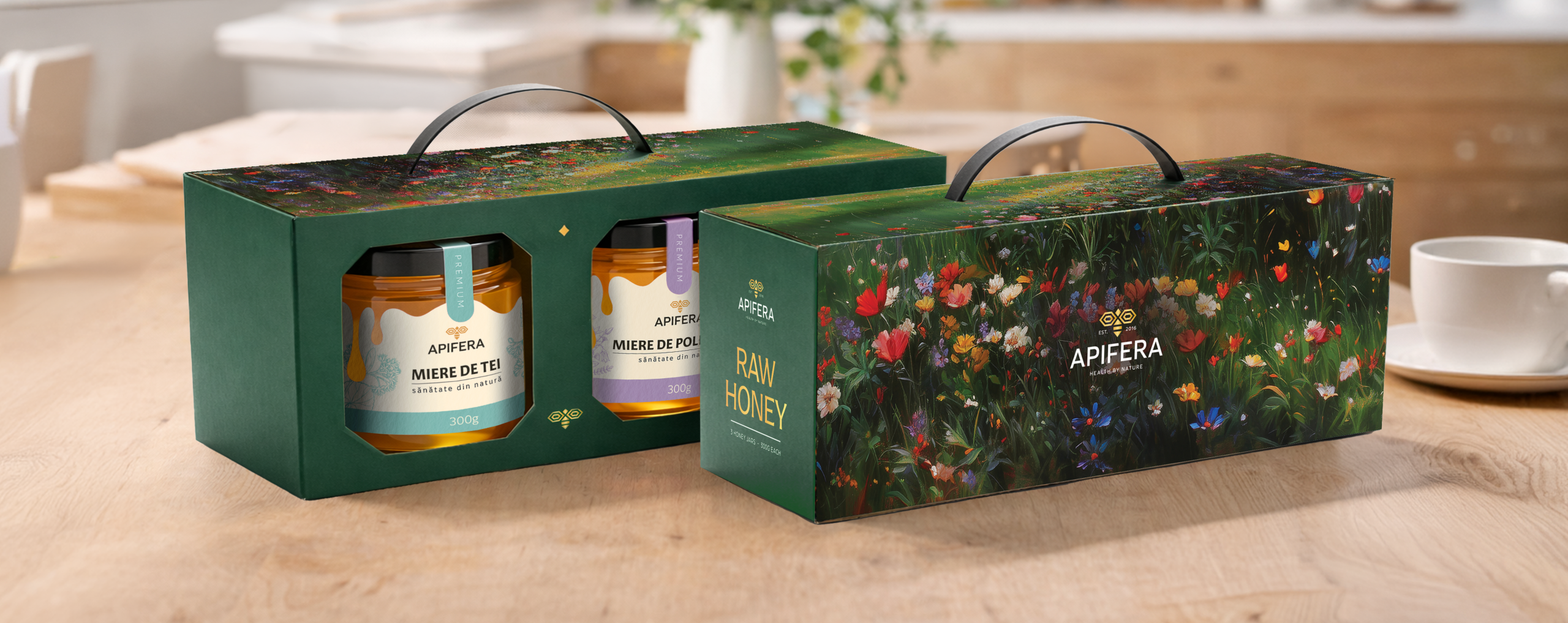 LE BURO continuă colaborarea cu APIFERA prin realizarea cutiei dedicate seturilor de miere, în două variante: miere clasică și miere cu nuci.