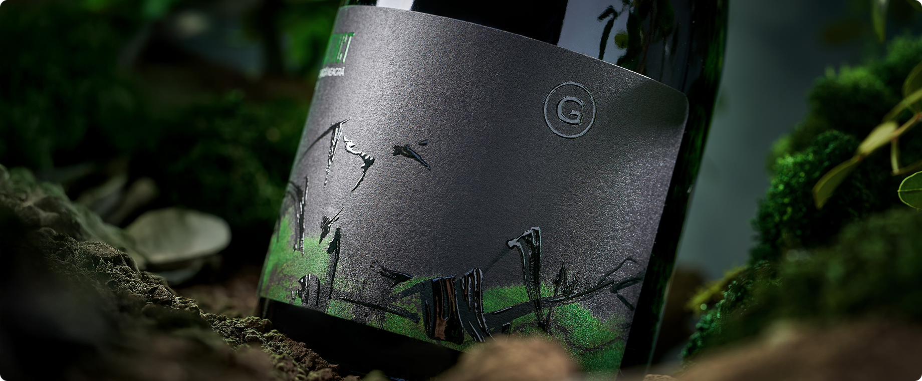 Eticheta este realizată pe o hârtie texturată, mată, cu finisaje speciale – embosare, print UV selectiv și accente metalice. Tipografia verticală „INSTINCT” în roșu vibrant adaugă tensiune, contrast și vizibilitate pe un fundal întunecat și misterios. Ilustrația minimalistă cu siluete de păsări sugerează mișcare și libertate – un simbol discret al instinctului de evadare, de zbor, de revenire la esențial. Designul este gândit să trezească emoție la prima vedere și să spună o poveste care rămâne în minte.