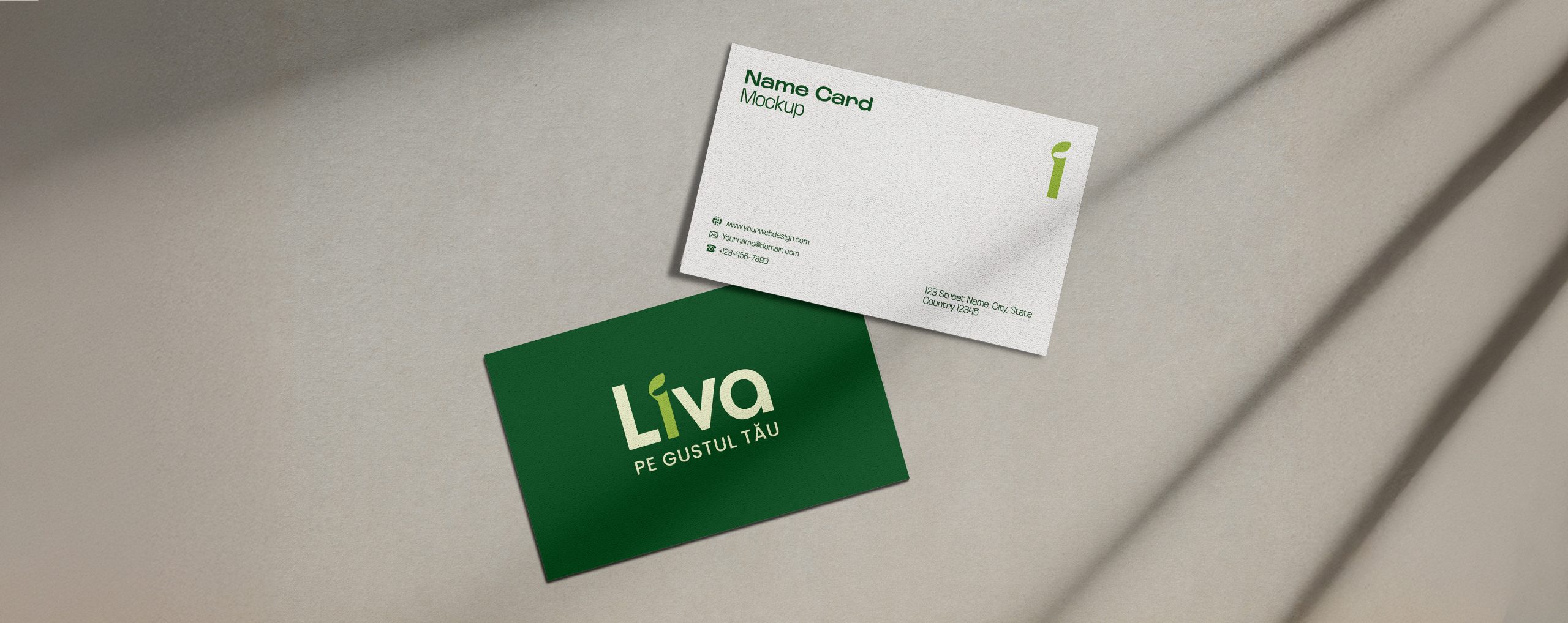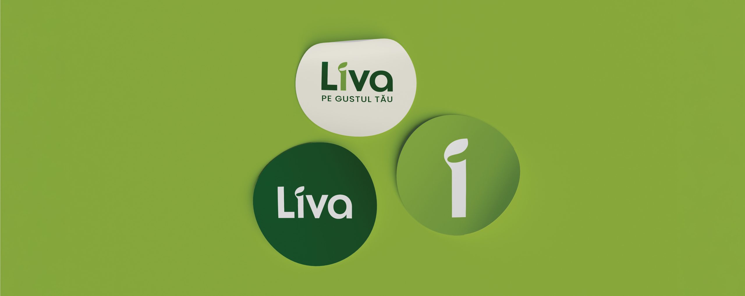 Логотип LIVA построен на округлой, сбалансированной типографике, а лист, интегрированный в букву «i», становится ключевым символическим элементом. Этот визуальный акцент передаёт свежесть, рост и связь с природой, усиливая позиционирование бренда в индустрии натуральных напитков.